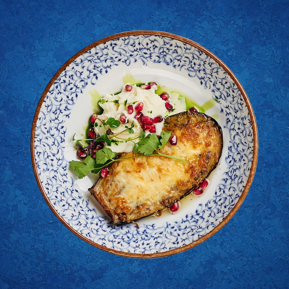 Запеченный баклажан с сулугуни и томатами в ореховом соусе